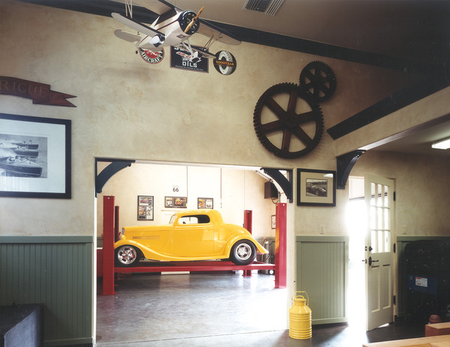 O proprietário desta casa de estilo Tudor, também por HartmanBaldwin e em Claremont, Califórnia, construiu sua fortuna através da fabricação e sempre quis um lugar onde ele poderia mexer (ele também ganha um monte de patentes) e restaurar carros clássicos.